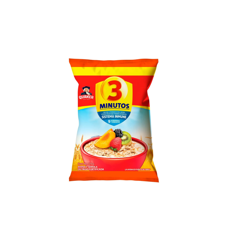 La avena y sémola de trigo fortificada de 3 Minutos®️ Quaker®️ natural es una opción de desayuno delicioso y nutritivo para ti y para toda tu familia, gracias a que su base de avena integral es fuente de fibra y está fortificada con vitaminas y minerales que pueden ayudar al sistema inmune. 3 Minutos®️ Quaker®️ natural es ideal para desayunar ya sea añadiendo frutas como manzana y durazno o en un delicioso licuado, para comenzar tu día recibiendo los beneficios de la avena.
