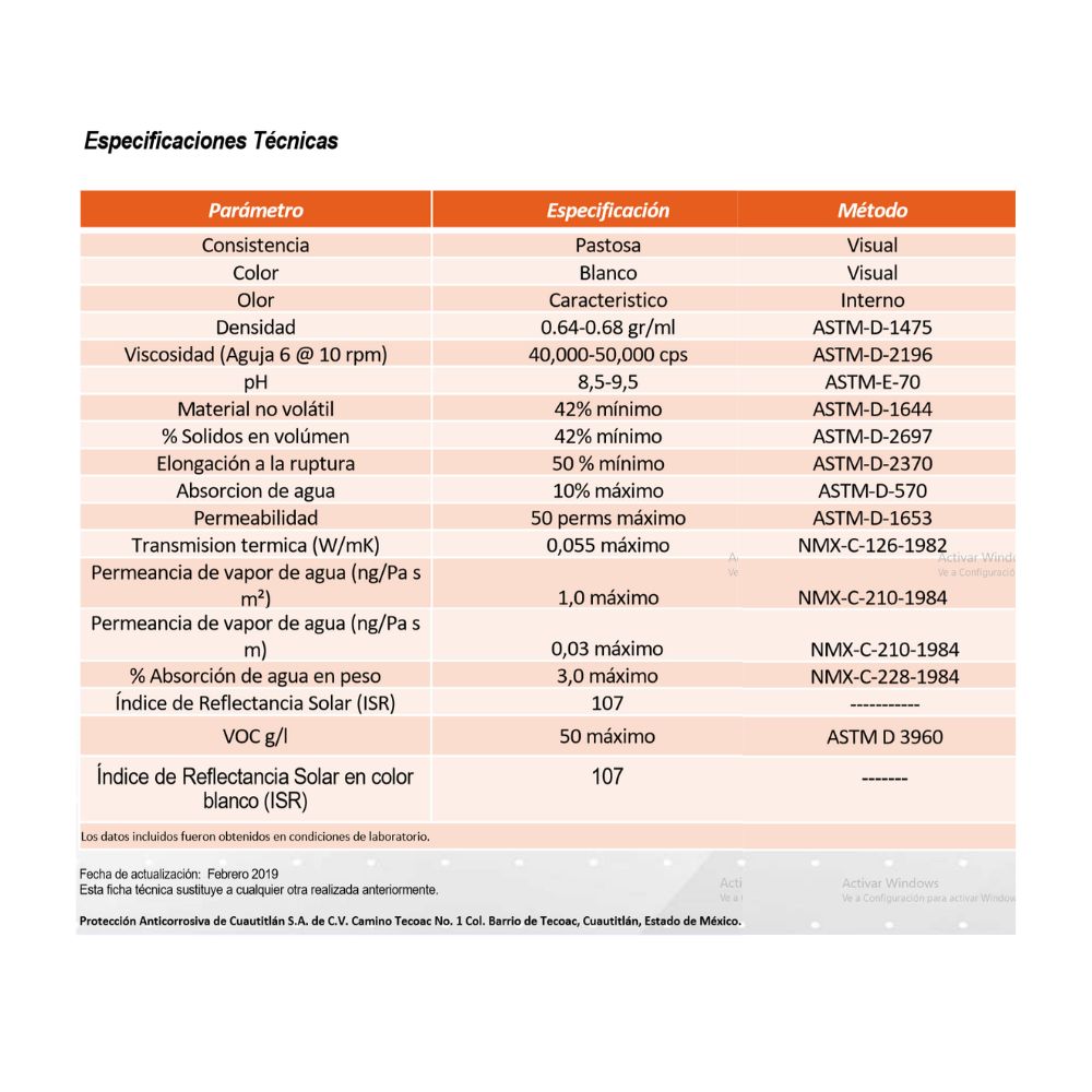 Impermeabilizante ahorrador de energía, todo en uno, de última generación. Por su alto índice de reflectancia solar (ISR) de 107, es una aislante térmico reflectante muy eficiente por lo que ayuda al interior de los inmuebles, aísla la temperatura generada por radiación solar, conservando frescos los diferentes tipos de techado. Disminuye el consumo de energía eléctrica por el uso de equipos de aire acondicionado. Tiene una vida útil de 5años.
