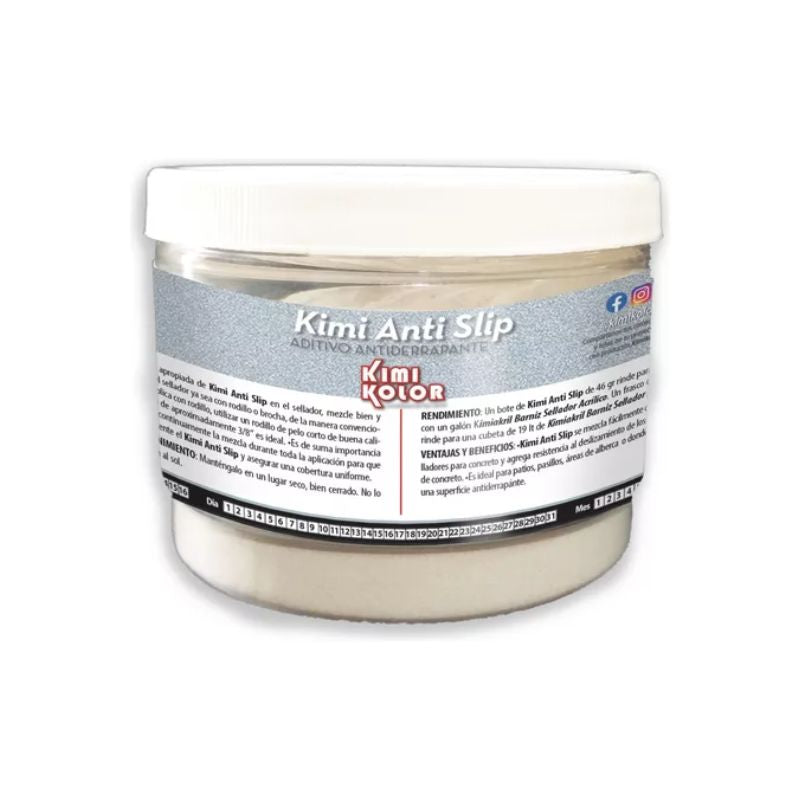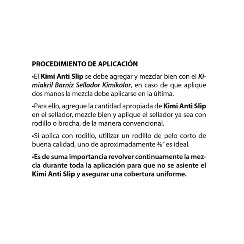 - Un bote de Kimi Anti Slip de 46 gr rinde para mezclar con un galón Kimiakril Barniz Sellador Acrílico.