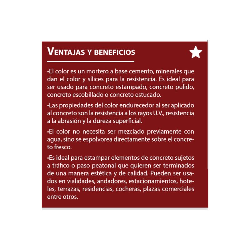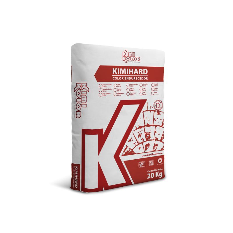 El KIMIHARD COLOR ENDURECEDOR KIMIKOLOR es un material en polvo especialmente diseñado para pigmentar pisos de concreto en fresco. Es un producto de alta calidad ya que contiene Cemento Pórtland, Aditivos y Endurecedores Minerales con un alto contenido de Sílice. Además, los pigmentos utilizados en su formulación son de alta resistencia tanto en interiores como exteriores. Independientemente de cambiar la tonalidad del concreto de manera superficial, nos da una mayor resistencia a la abrasión. Puede ser utilizado para dar acabados en concreto estampado, concreto pulido, acabado escobillado, estucado, entre otros.