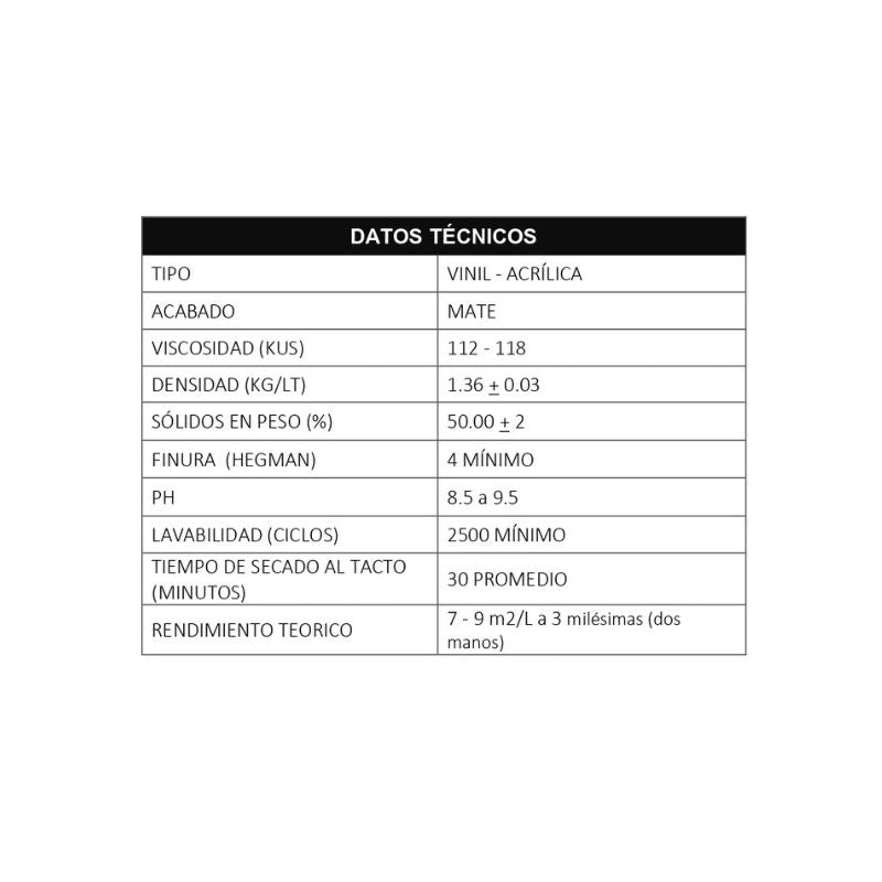Pintura Vinil-Acrílica de acabado mate de buen poder cubriente y excelente balance entre precio y validad ideal para el contratista exigente.