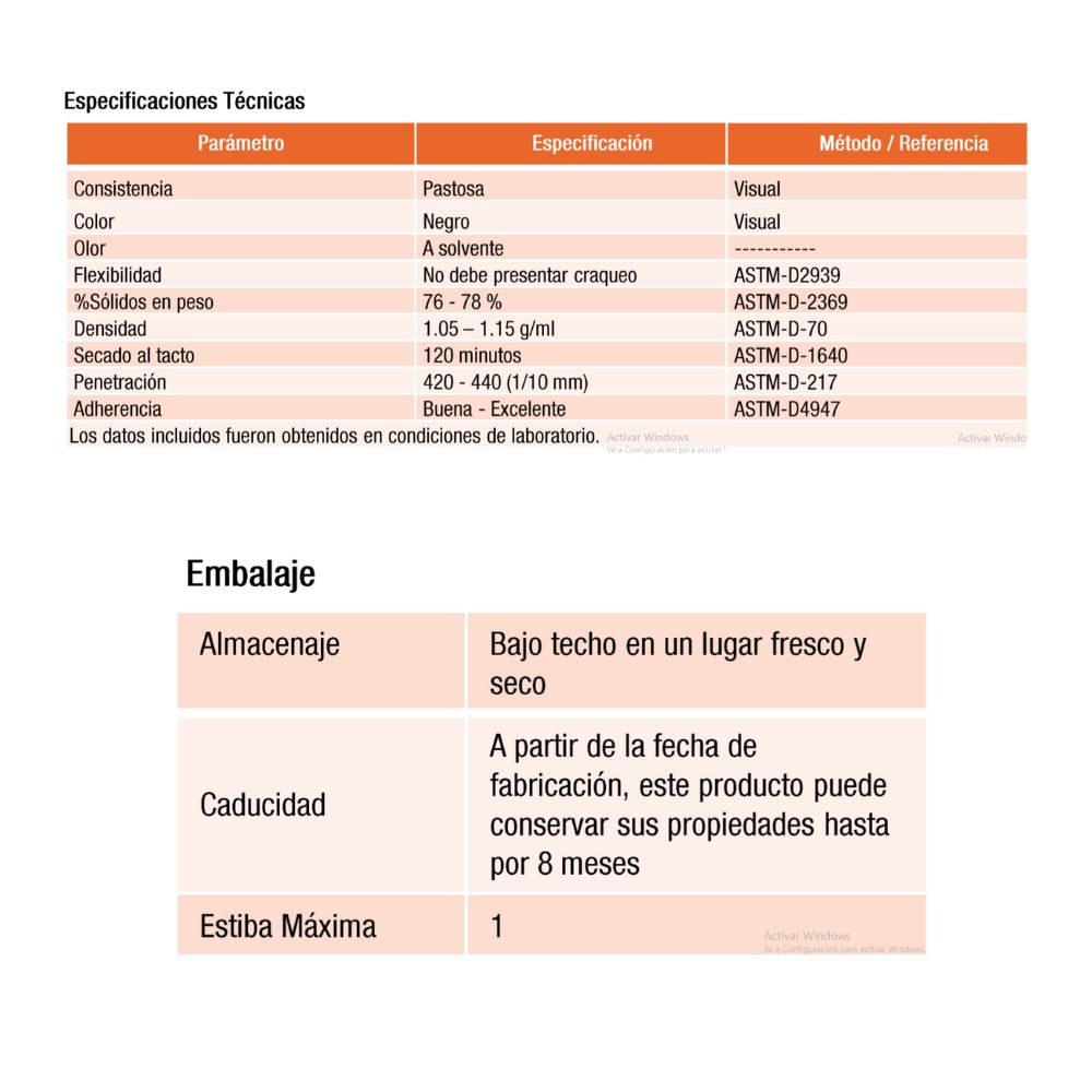 Impermeabilizante (pasta) asfáltico base solvente de usos múltiples, en color negro, elaborado con asfaltos refinados, extendedores (agregados) minerales, fibras naturales de refuerzo libres de asbesto, disolventes (solventes seleccionados) de rápida evaporación; proporcionando extraordinaria impermeabilidad, adherencia, resistencia, y elasticidad.