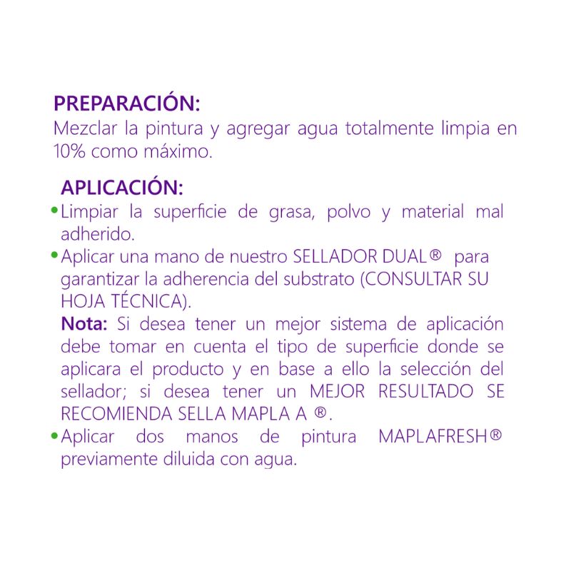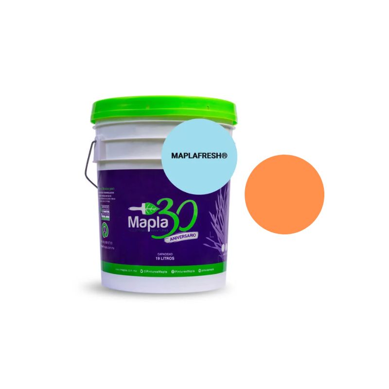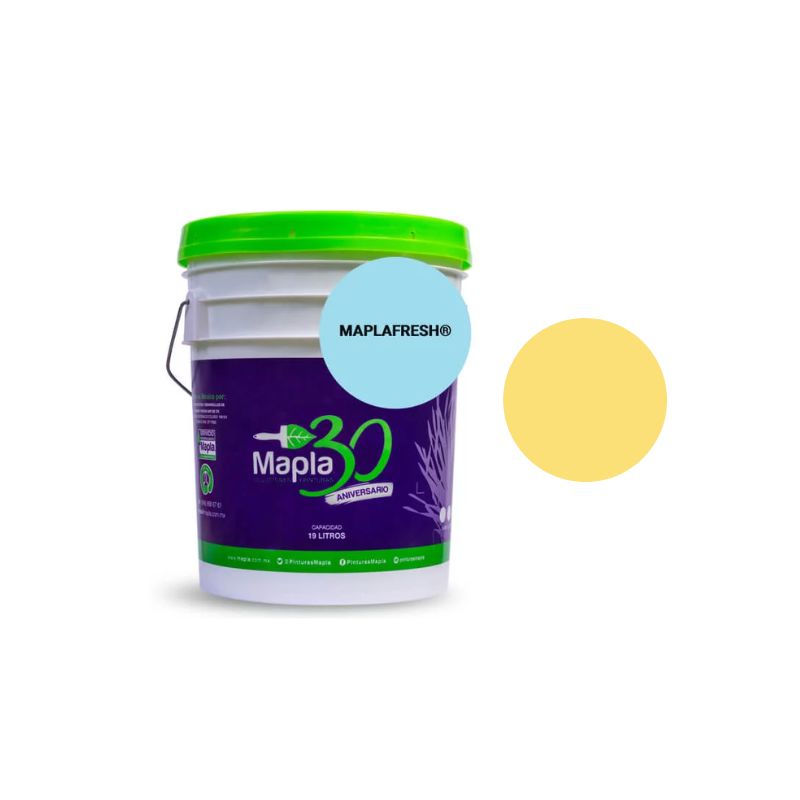 MAPLAFRESH® es una pintura de alto rendimiento y buena calidad. Está formulada con resinas estiren-acrílicas, cargas minerales, pigmentos y aditivos estabilizadores que brindan cualidades como: excelente lavabilidad y alta resistencia.