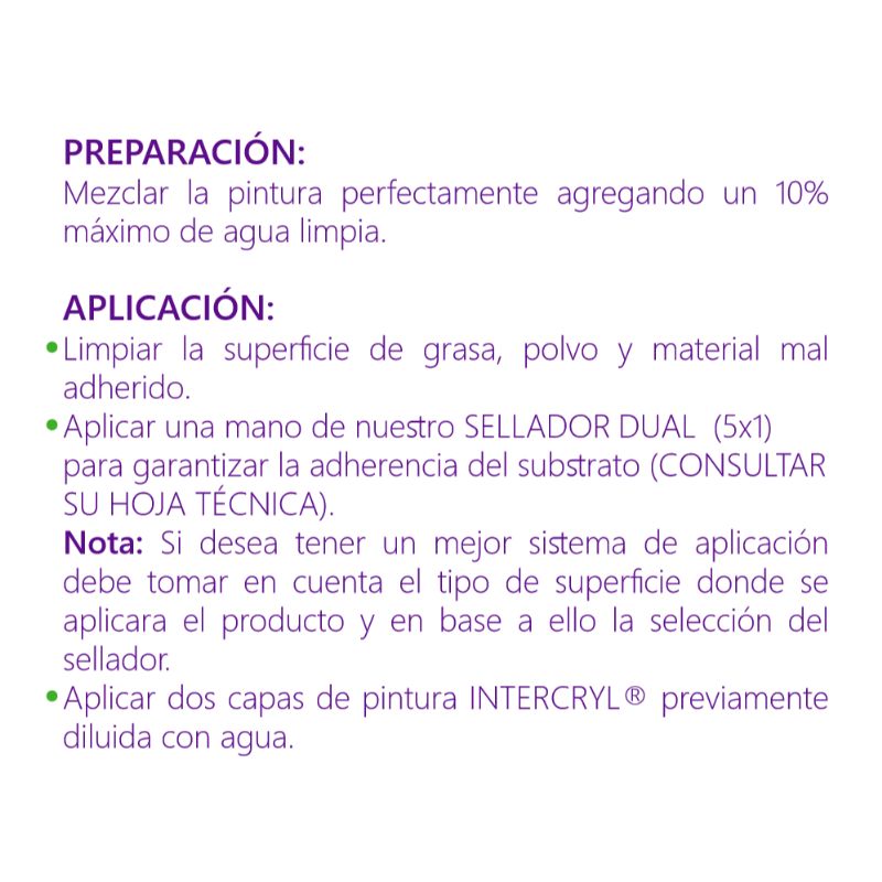 INTERCRYL® es una pintura interior de buena calidad y buen poder cubriente. Está formulada con polímeros estiren-acrílicos de última generación y aditivos estabilizantes.